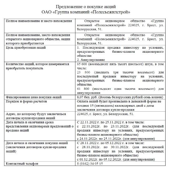 ОАО «Группа компаний «Полесьежилстрой» извещает о приобоетении на баланс общества акций, выпущенных ОАО «Группа компаний «Полесьежилстрой».