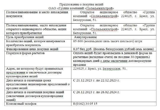ОАО «Группа компаний «Полесьежилстрой» извещает о приобретении на баланс общества акций, выпущенных ОАО «Группа компаний «Полесьежилстрой»